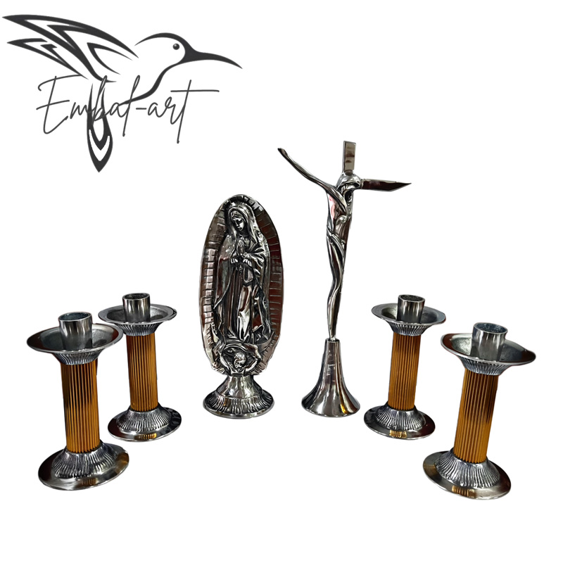 Este juego para novenario, con un elegante acabado dorado, está diseñado especialmente para funerarias y embalsamadores. Ideal para ofrecer un toque solemne y decorativo durante los servicios funerarios.